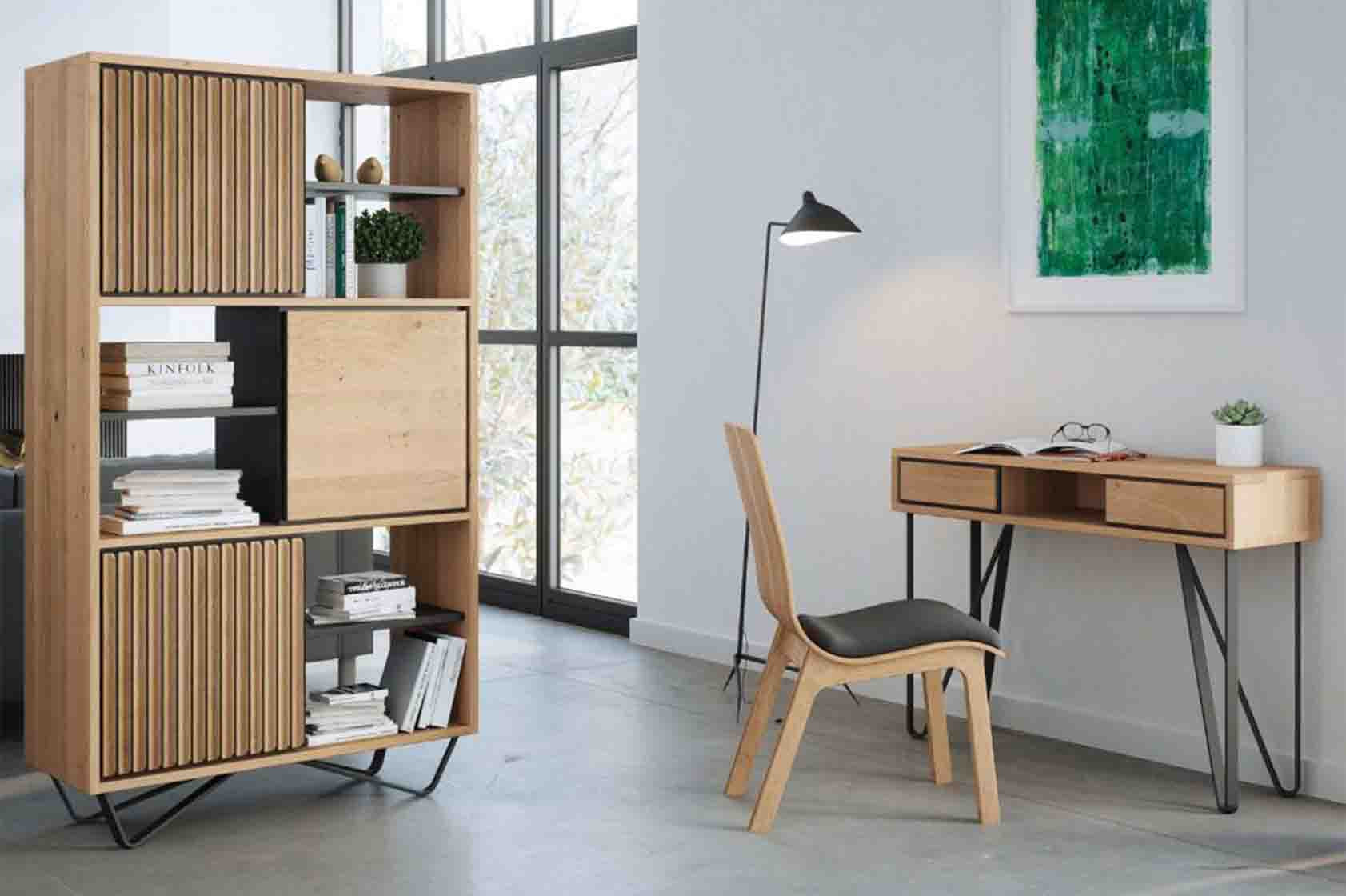 Cette bibliothèque en bois a été façonnée à partir d’un chêne naturel. Ce bois noble, associé à quelques touches d’anthracite, créent un jeu de perspective élégant. La surface des 3 portes, quant à elle, affiche de la solidité et du caractère. À propos de sa fabrication, elle est intégralement européenne avec un haut niveau d’exigence en matière de construction. De quoi ravir les amateurs de beaux mobiliers !