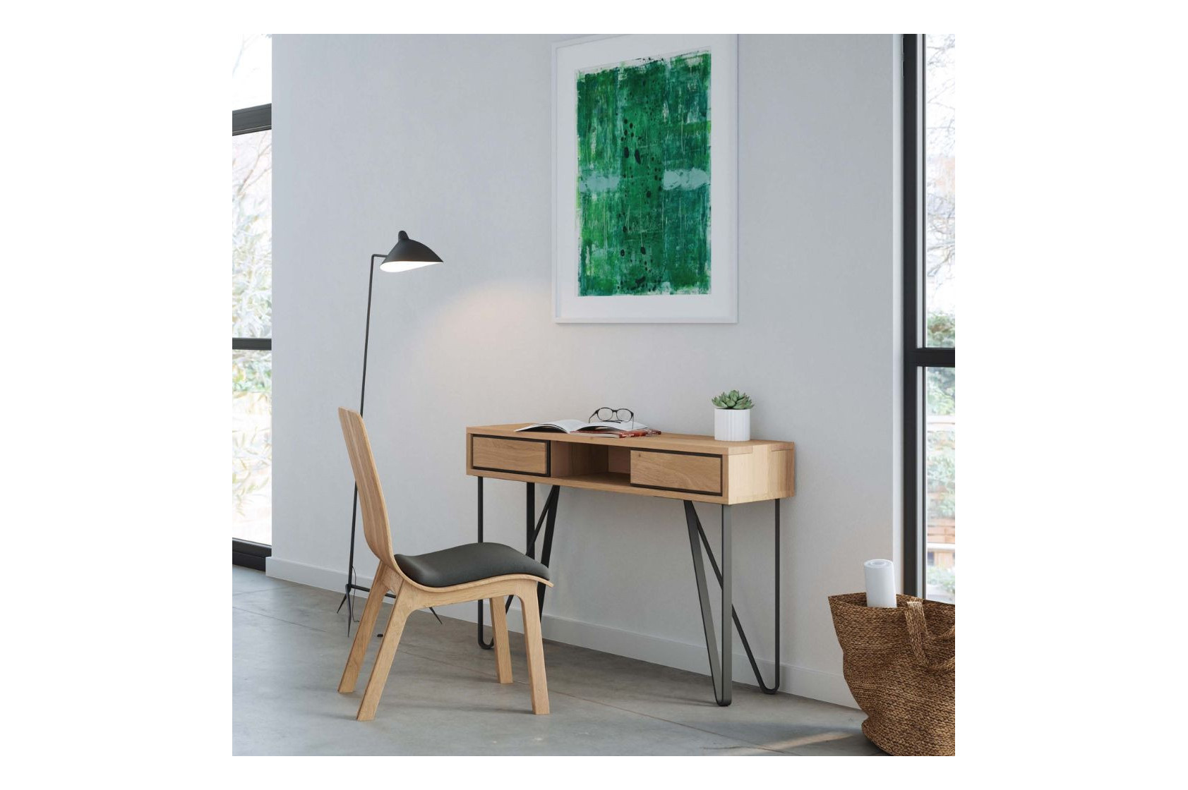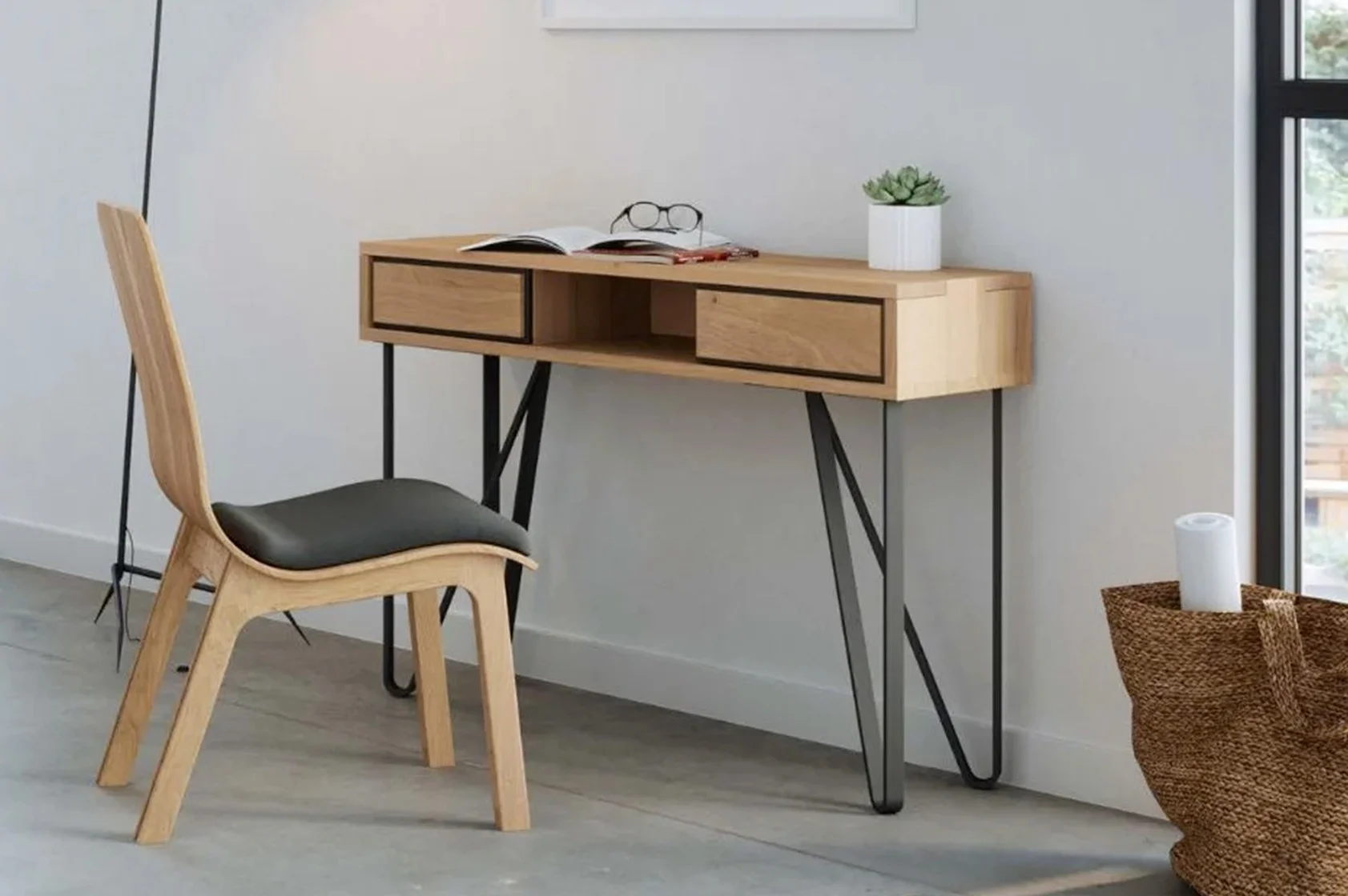 Il s'agit d’un bureau qui peut aussi servir de console en bois de chêne. Elle est munie de deux tiroirs et d'une niche. Le design reste sobre et chic tout en étant professionnel. Vous pourrez l'utiliser partout où vous voudrez. Ce modèle économise de la place et s'adapte très bien à tout type de décoration d’intérieur. Fini les soucis de table trop grande et encombrante.