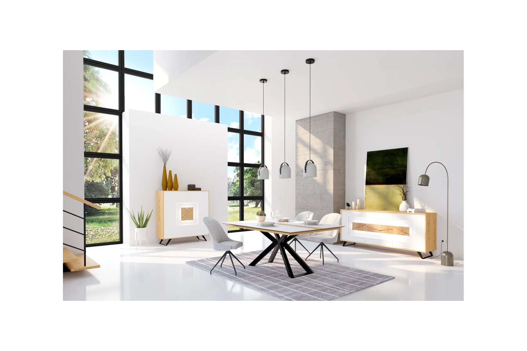contemporain et comprend plusieurs meubles de salle à manger ou salon. Avec