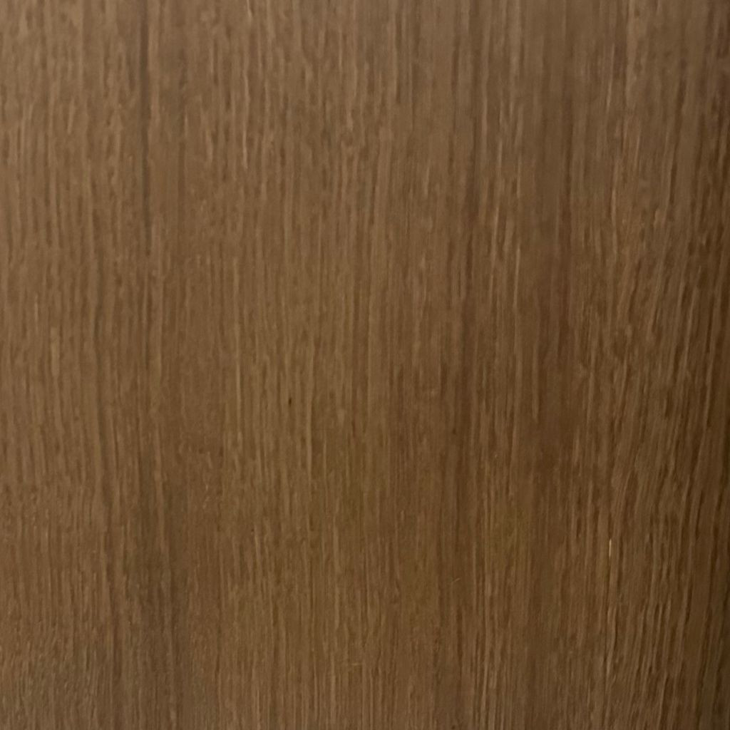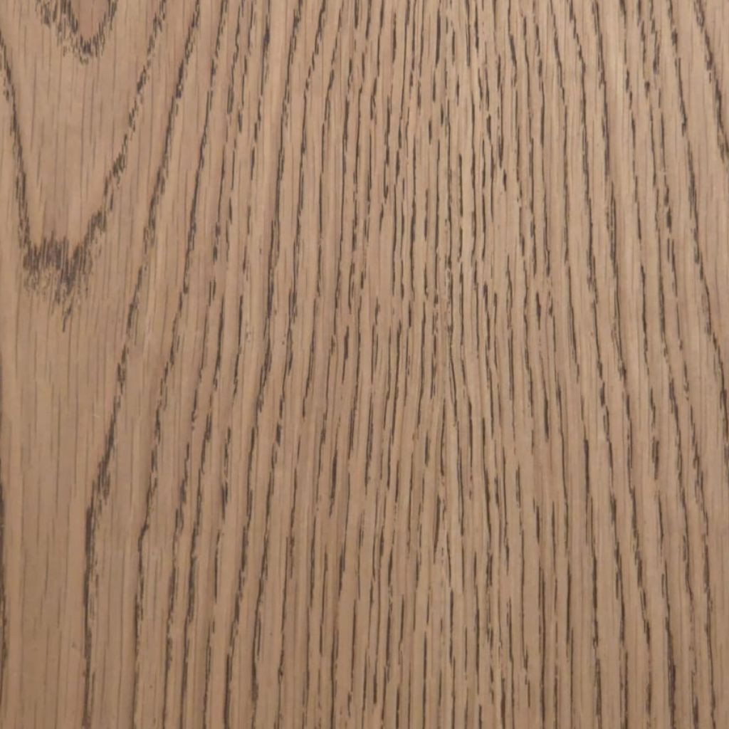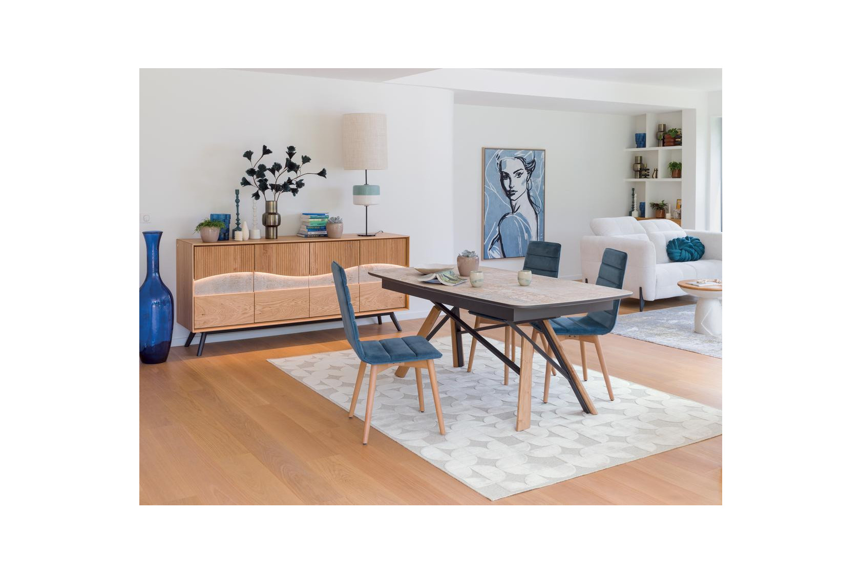 Matière : panneaux de particules et MDF plaqué chêne, application nervurée en bois massif, céramique épaisseur 4 mm sur MDF. Portes et étagères en verre sécurit épaisseur 4 mm ou 6 mm. Pieds en bois massif. Teinte à l'eau, vernis acrylique. Étagères amovibles, 3 en verre et 1 en bois. Fabrication européenne.