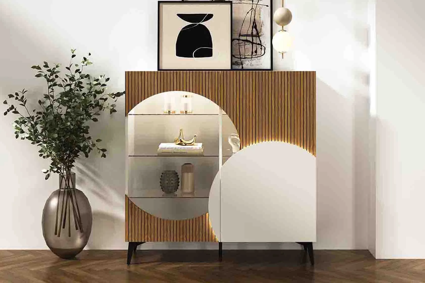 Principales matières, essences ou matériaux : structure en panneaux de particules mélaminé laqué, portes en MDF laqué, striures en MDF plaqué chêne.