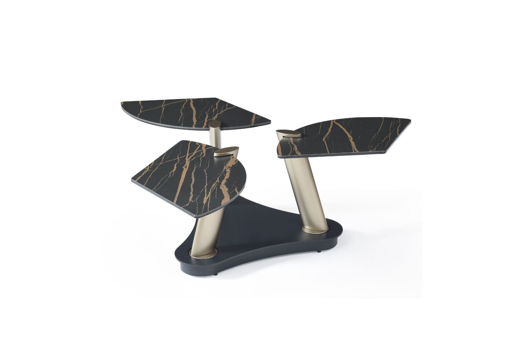Les plateaux en céramique noir et doré se distinguent par leur robustesse et leur facilité d’entretien. Ils reposent sur 3 pieds en métal doré, reliés à une structure noire en métal, qui garantissent une excellente stabilité tout en ajoutant une note contemporaine. Cette table basse est parfaite pour ceux qui recherchent une pièce qui apporte du chic à un intérieur tout en ayant une fonction pour optimiser votre espace.