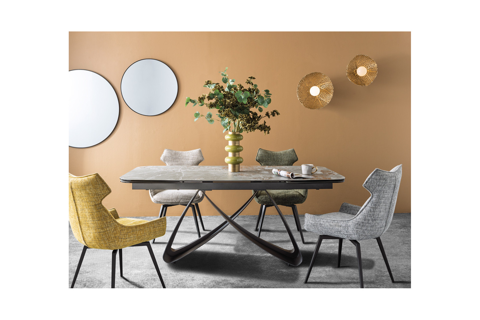Cette table de salle à manger sera sans aucun doute une pièce maîtresse de votre décoration. Ici, tout n’est que jeu de matières : un piétement central en métal noir tout en courbes, combiné à un plateau en céramique à l’effet marbré des plus chics.