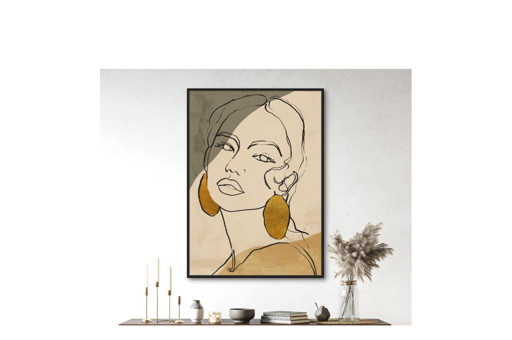 Le visage se dessine d’un simple trait noir, rehaussé par deux boucles dorées texturées qui attirent la lumière et captivent le regard.
