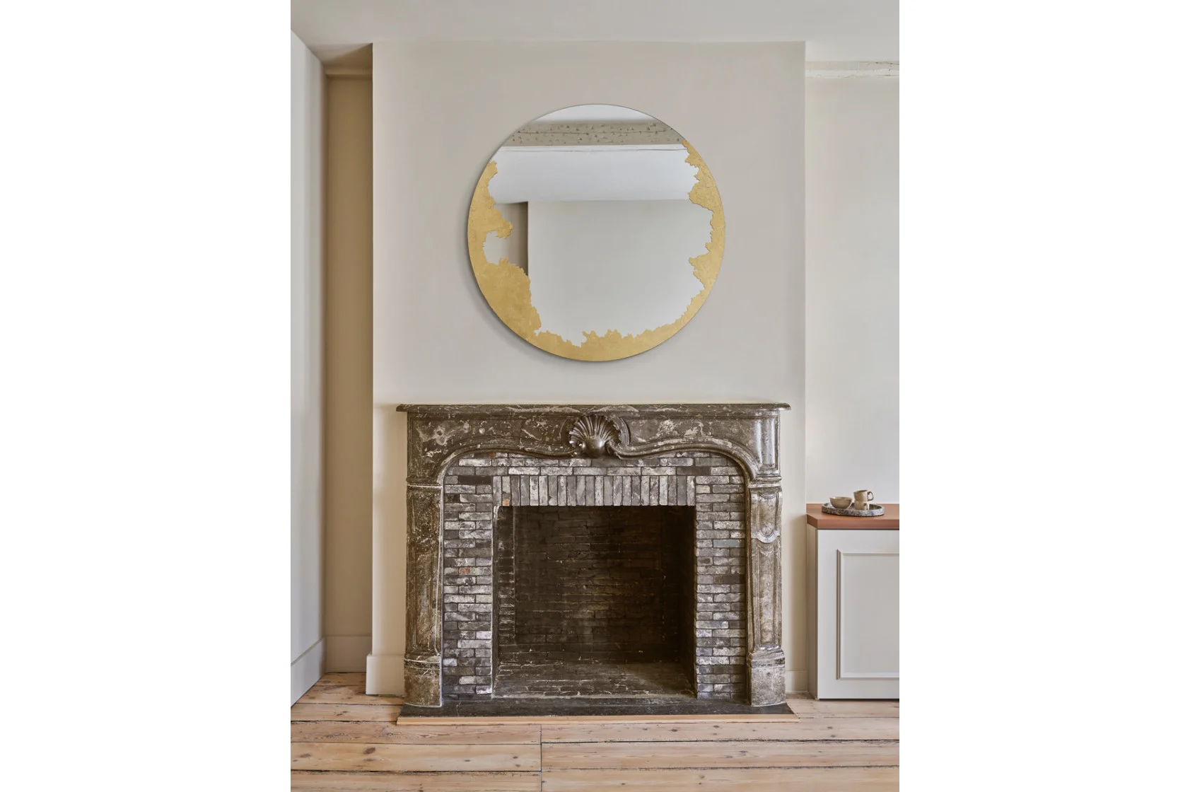 Les feuilles d’or appliquées à la main forment un motif naturel unique pour chaque miroir.