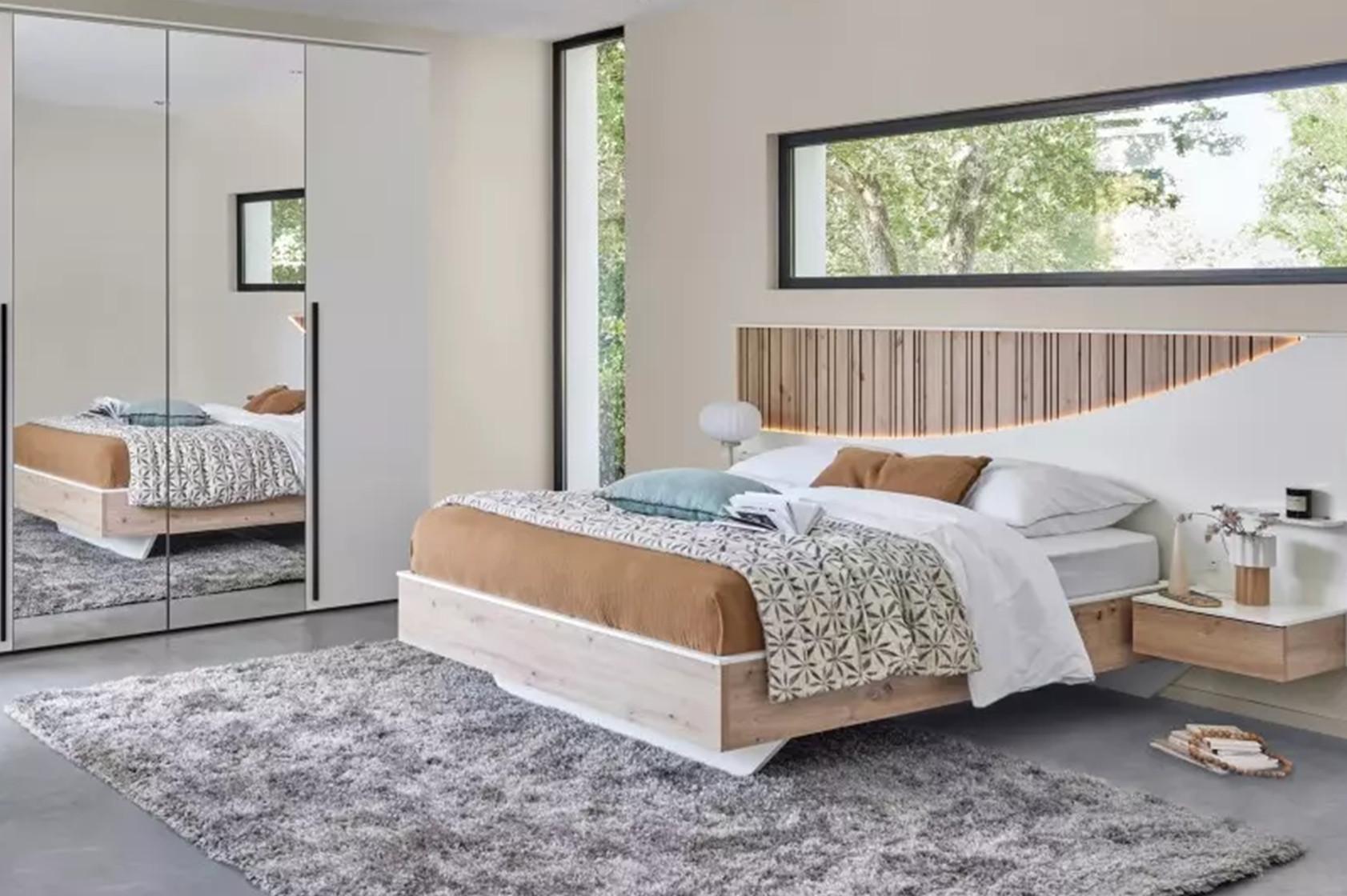 L'éclairage LED de la tête de lit met délicatement en lumière les rainures... et surtout vous permet de lire votre livre préféré ! Les chevets intégrés ainsi que la prise USB et USB-C de chaque côté du lit seront également très pratiques pour poser et charger votre téléphone.