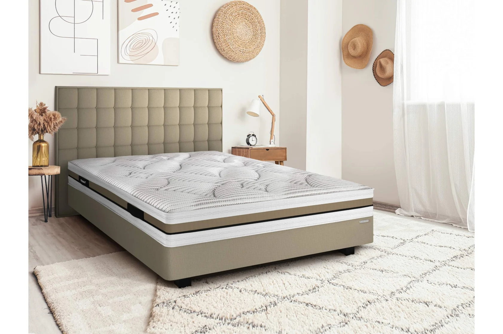 Finition matelas : 4 poignées horizontales brodées, platebande 2/3 Aéroflex et 1/3 microfibre taupe.