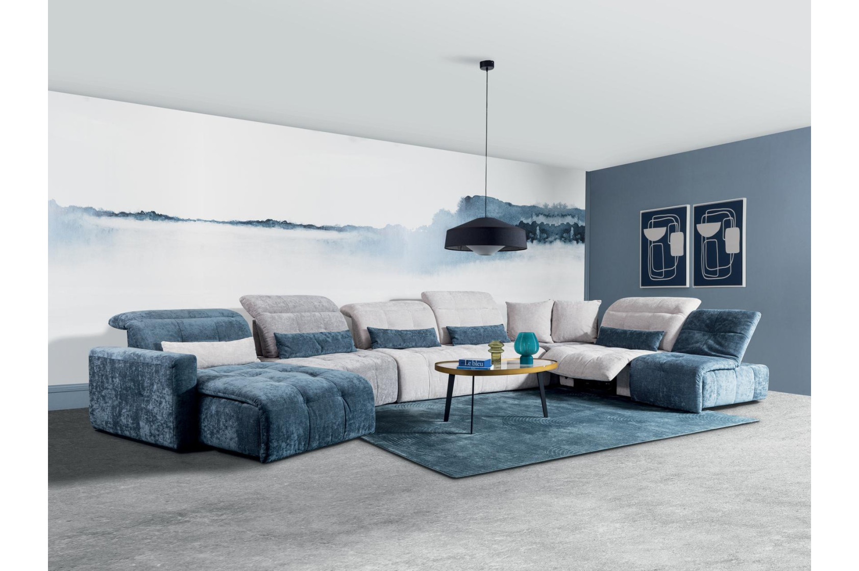Canapé d'angle comprenant : Base asymétrique, dossier posé avec têtière relevable, banquette 2 places 2 dossiers basculants 2 têtières relevables, angle pouf avec dossier posé et 2 coussins 60x60, chauffeuse 1 dossier basculant têtière relevable et pied relaxation électrique, demi-pouf avec dossier relevable.