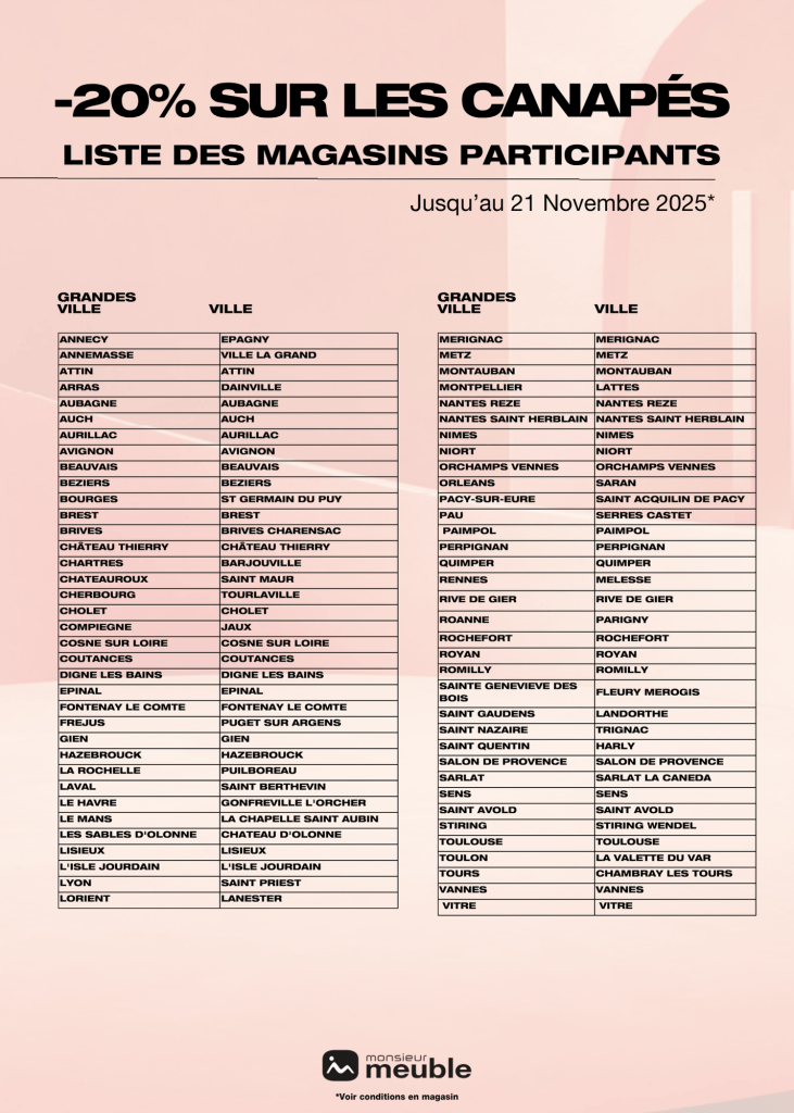 Retrouvez ci-dessous la liste des magasins participants à l'opération "-20% sur les canapés".