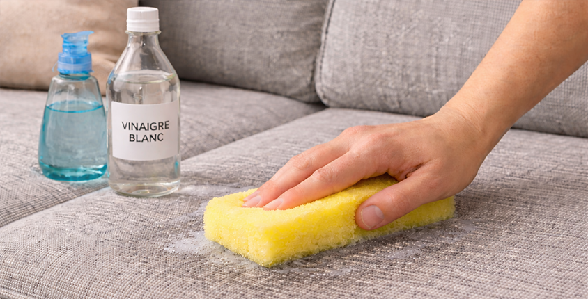 Il est connu pour son efficacité sur les taches tenaces. Mélangez 500 ml de vinaigre blanc, 200 ml d’eau tiède et une cuillère à soupe de liquide vaisselle. À l’aide d'une éponge bien essorée, appliquez sur le canapé, puis rincez avec un chiffon humidifié à l’eau claire. Enfin, séchez bien à l’aide d’un linge propre et sec.