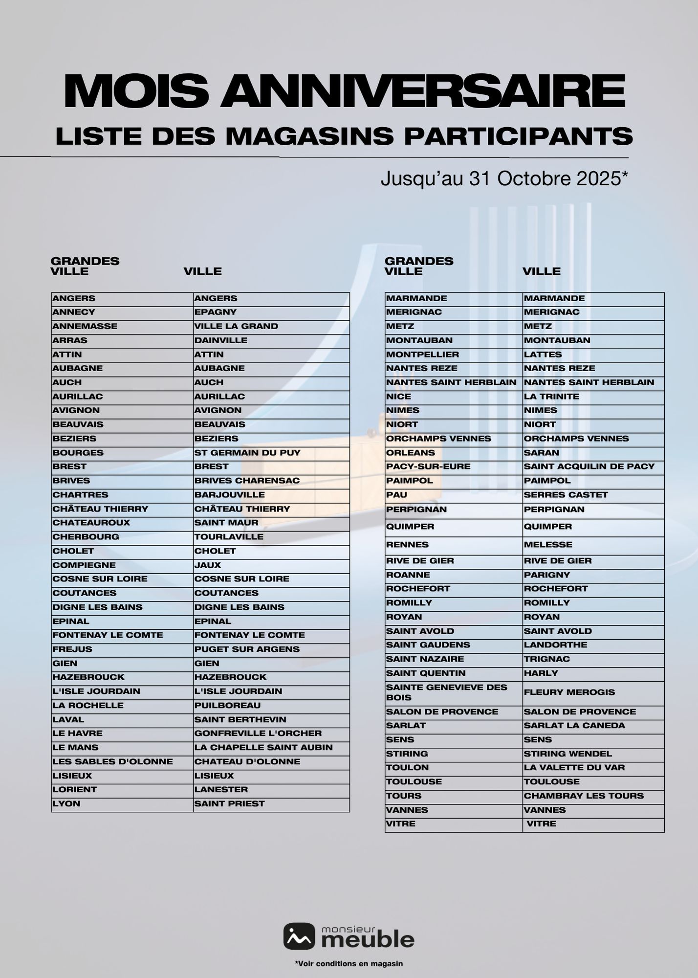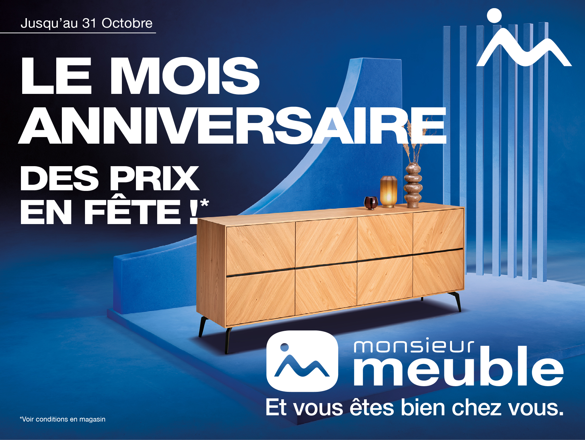 A l'occasion de l'anniversaire de Monsieur Meuble profitez de promotions exclusives ! Bénéficiez des meilleures offres dans votre magasin Monsieur Meuble.