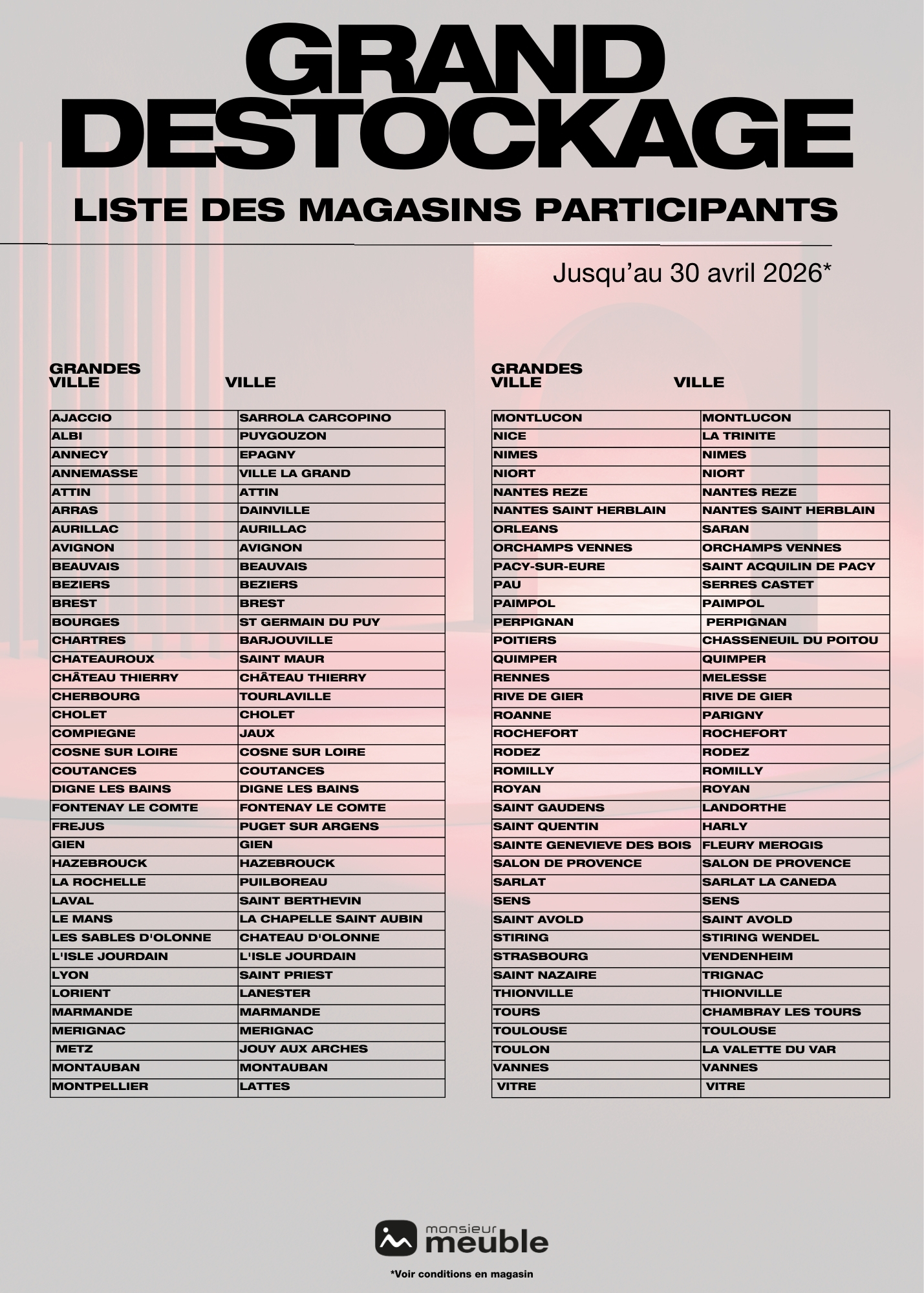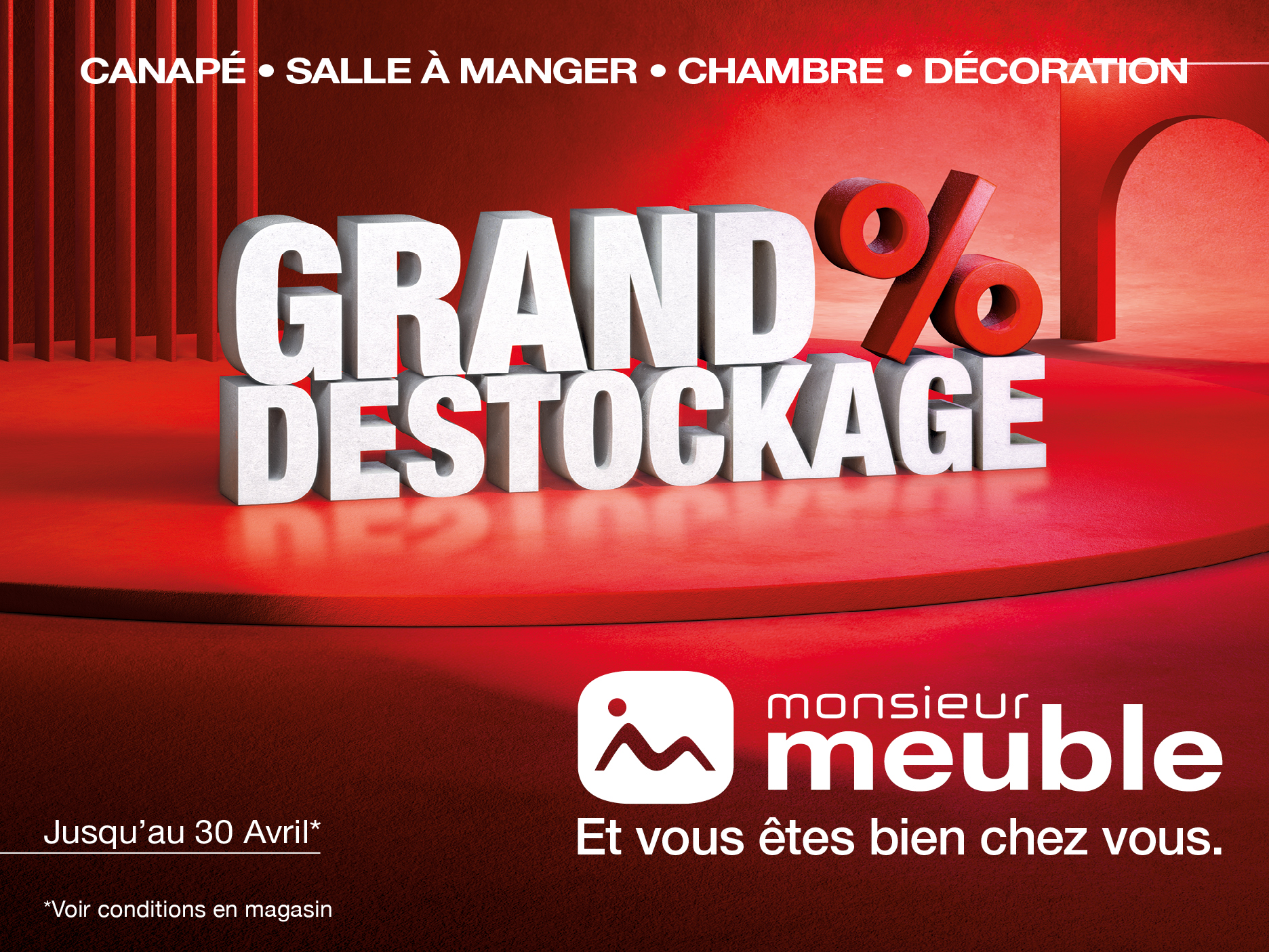 Envie de changer d’ambiance ou d’optimiser votre espace à l’arrivée du printemps ? Du 1er mars au 30 avril, le Grand Destockage vous permet de bénéficier d’une offre de destockage sur une sélection de meubles pour concrétiser vos envies sans attendre. C’est l’opportunité de donner vie à un nouveau projet déco, qu’il s’agisse d’une salle à manger plus conviviale ou d’un salon plus confortable. Nos équipes vous accueillent et vous conseillent dans votre magasin Monsieur Meuble.